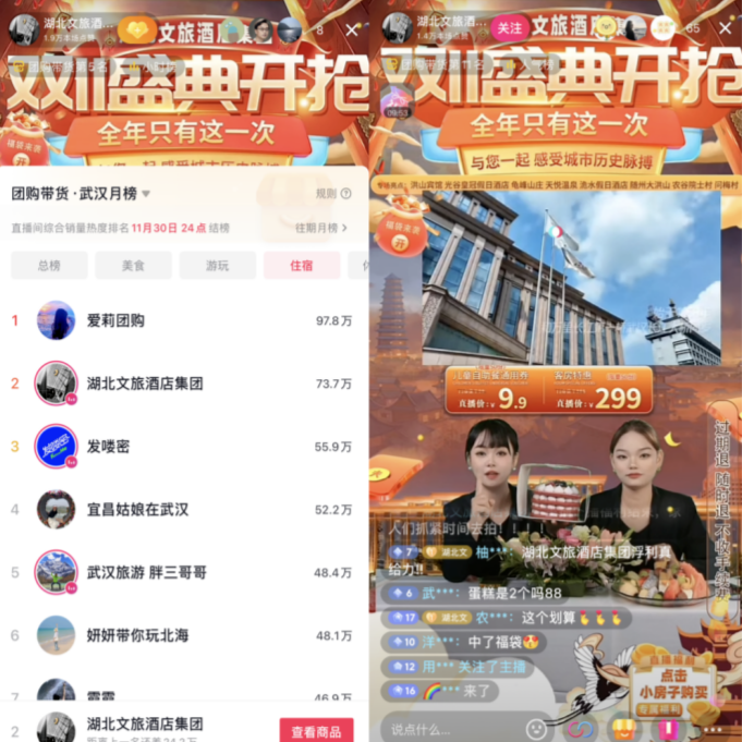 首戰(zhàn)告捷!數(shù)旅集團(tuán)聯(lián)手酒店集團(tuán)“雙十一”直播,躋身武漢團(tuán)購(gòu)帶貨榜單月榜第2名
