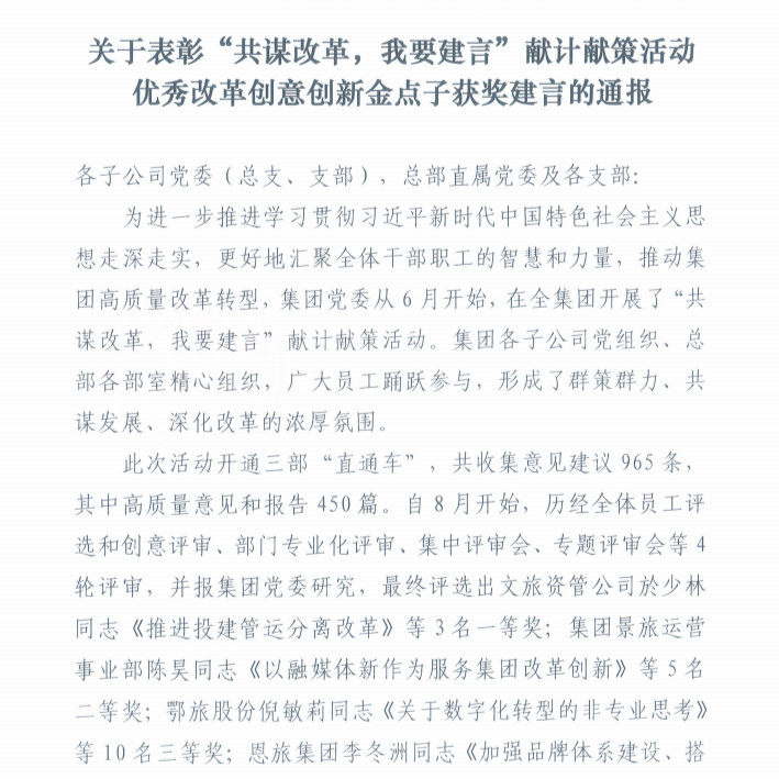 數(shù)旅集團(tuán)獲“共謀改革、我要建言”優(yōu)秀獎(jiǎng)